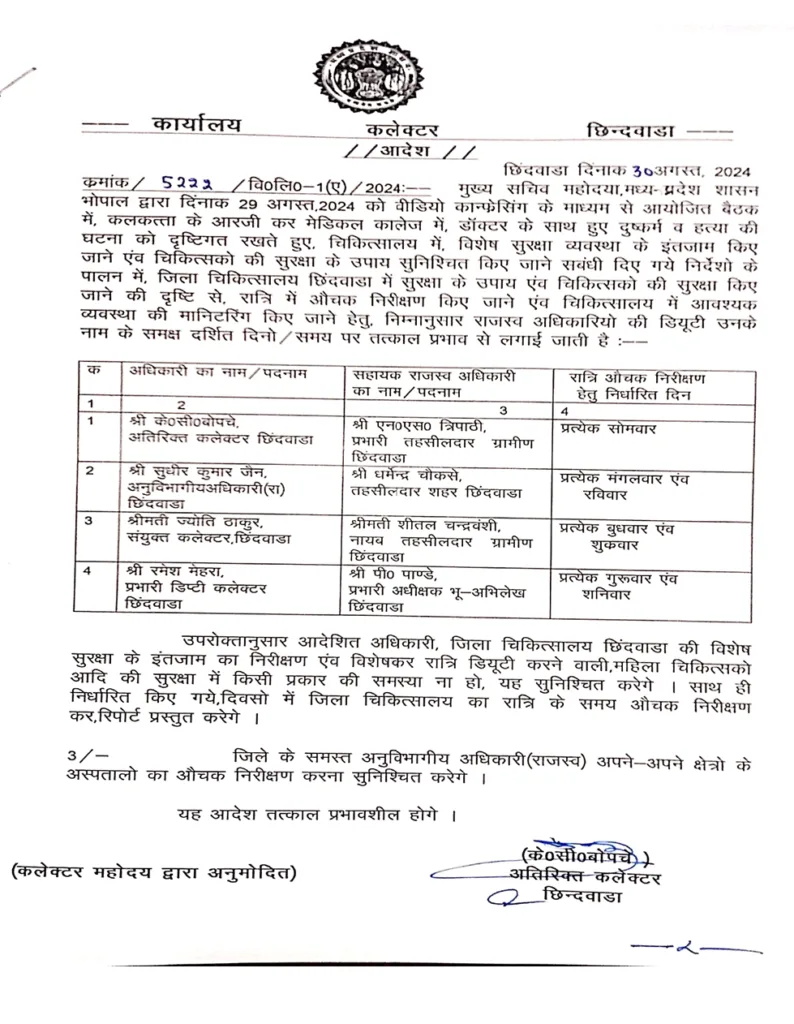 सतपुड़ा एक्सप्रेस छिंदवाड़ा / शासन के निर्देशों के परिपालन में कलेक्टर शीलेंद्र सिंह ने जिला चिकित्सालय छिंदवाडा में सुरक्षा के उपाय एवं चिकित्सकों की सुरक्षा सुनिश्चित किए जाने की दृष्टि से रात्रि में औचक निरीक्षण व चिकित्सालय में आवश्यक व्यवस्था की मॉनिटरिंग किये जाने के लिए विभिन्न राजस्व अधिकारियों की ड्यूटी लगाई है। इसी क्रम में शुक्रवार की रात्रि 12 बजे संयुक्त कलेक्टर ज्योति ठाकुर व नायब तहसीलदार साक्षी शुक्ला द्वारा जिला चिकित्सालय छिंदवाडा का औचक निरीक्षण किया गया।