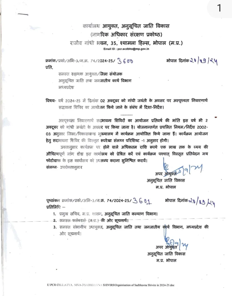2 अक्टूबर को गांधी जयंती के अवसर पर सद्भावना मेले का आयोजन जिला स्तर पर किया जाना था लेकिन काउंसलिंग के खेल में सद्भावना मेला लगाना भूले गए सहायक आयुक्त और वर्ष 2024-25 में दिनांक 02 अक्टूबर को गांधी जयंती के अवसर पर अस्पृश्यता निवारणार्थ सद्भावना शिविर का आयोजन आज दिनांक तक नही किया गया।