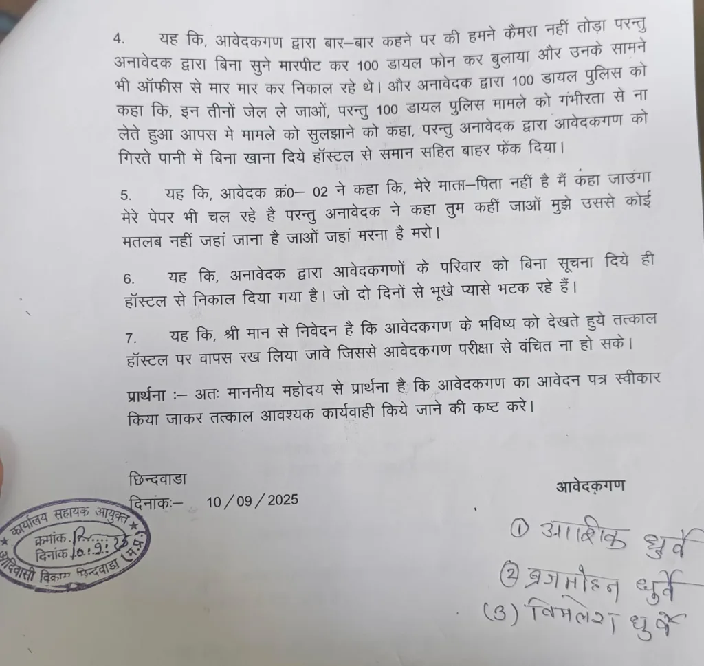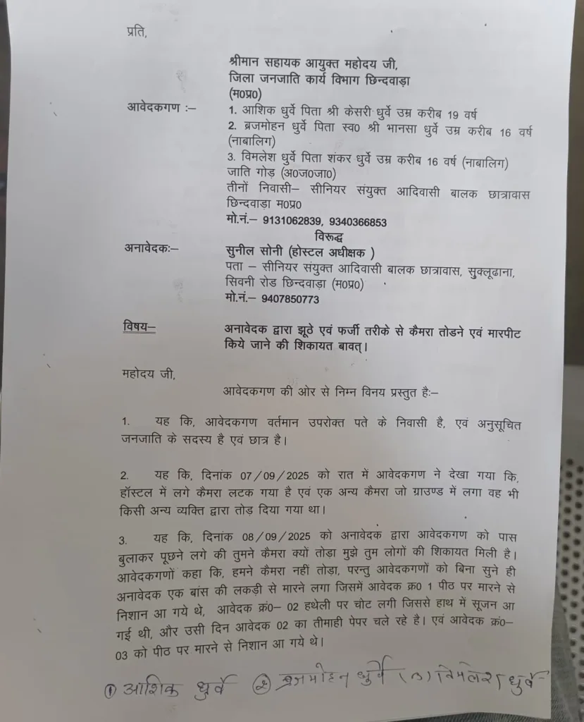 छात्रों का आरोप आवेदकों में आशिक धुर्वे (19), ब्रजमोहन धुर्वे (16, नाबालिग) और विमलेश धुर्वे (16, नाबालिग) शामिल हैं। सभी अनुसूचित जनजाति (गोंड) के छात्र हैं और छिंदवाड़ा स्थित आदिवासी छात्रावास में रह रहे थे।छात्रों के अनुसार –07 सितंबर 2025 को हॉस्टल में लगे दो सीसीटीवी कैमरे टूटे पाए गए।08 सितंबर 2025 को अधीक्षक सुनील सोनी ने तीनों छात्रों को बुलाकर कैमरा तोड़ने का आरोप लगाया। छात्रों के इंकार करने के बावजूद अधीक्षक ने उन्हें बांस की लकड़ी से पीटा।पिटाई में छात्रों को हाथ, पीठ और शरीर पर चोटें आईं।अधीक्षक ने 100 डायल पुलिस को भी बुलाया और छात्रों को जेल भेजने की बात कही, लेकिन पुलिस ने आपसी सुलह का सुझाव दिया।इसके बाद अधीक्षक ने छात्रों को बारिश में बिना खाना दिए हॉस्टल से बाहर निकाल दिया।