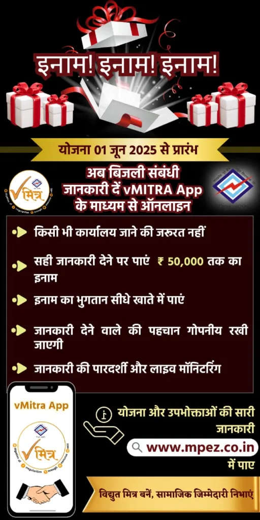 ऐप के माध्यम से दी गई सूचना की गोपनीयता सुनिश्चित की गई है, और उपयोगकर्ता स्वयं उस सूचना की स्टेटस ट्रैकिंग भी कर सकेंगे।मुख्य विशेषताएं:vMITRA App पर करें बिजली चोरी या अनियमितता की रिपोर्टिंगजांच के बाद सही जानकारी पर 50 हजार रुपये तक का इनामजानकारी देने वाले की पहचान पूर्णतः गुप्त1 जून से योजना होगी लागूएप पर दी गई रिपोर्ट की निगरानी सुविधा उपलब्ध”विद्युत मित्र बनें, सामाजिक जिम्मेदारी निभाएं”योजना की विस्तृत जानकारी और दिशा-निर्देशों के लिए विज़िट करें:www.mpez.co.in