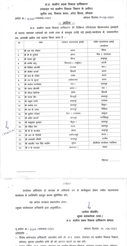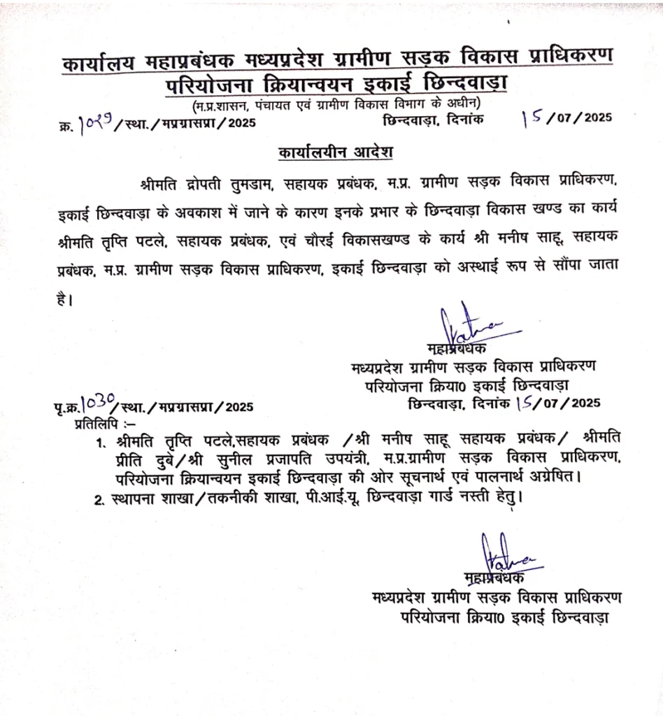 सतपुड़ा एक्सप्रेस:छिंदवाड़ा। मध्यप्रदेश सड़क विकास प्राधिकरण (MPRRDA PIU CHHINDWARA MP) की छिंदवाड़ा इकाई क्रमांक-1 में तैनात महाप्रबंधक (GM) कविता पटवा एक बार फिर अपने फैसले को लेकर विवादों में हैं। इस बार उन्होंने सहायक प्रबंधक (AM) मनीष साहू पर विशेष मेहरबानी दिखाते हुए नियमों को दरकिनार कर नया कार्य विभाजन आदेश जारी किया है।