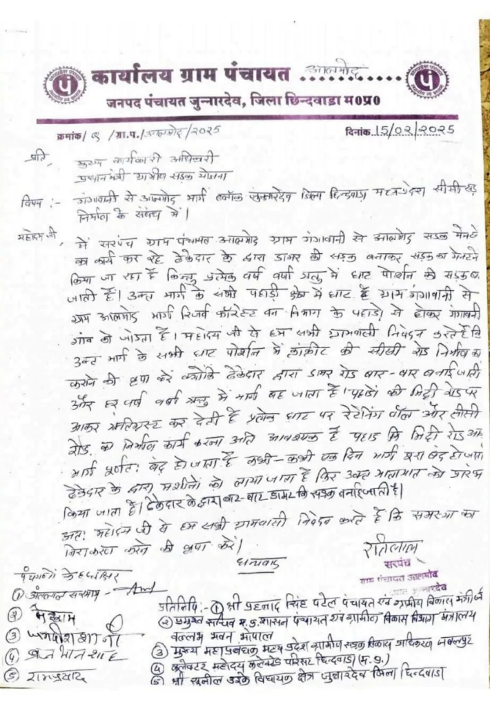 सतपुड़ा एक्सप्रेस छिंदवाड़ा ।जिले के जुन्नारदेव विकासखंड अंतर्गत प्रधानमंत्री ग्रामीण सड़क विकास प्राधिकरण द्वारा गंगवानी से आलमोद तक सड़क निर्माण कार्य का ठेका केजीएन कंस्ट्रक्शन को दिया गया था। इस मार्ग के बीटी रिनुअल हेतु महाप्रबंधक कविता पटवा द्वारा कार्यादेश भी जारी किया गया था।