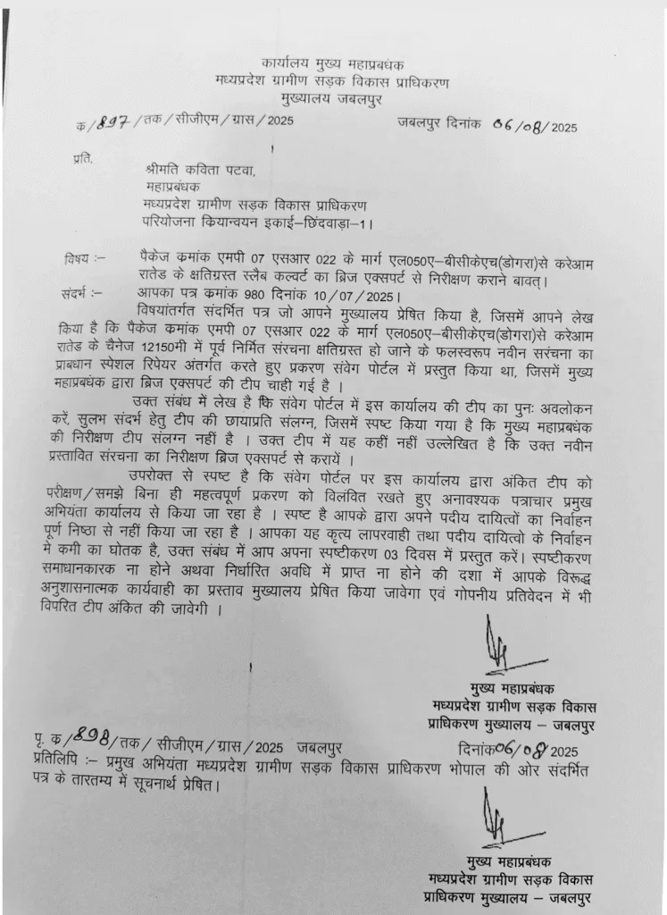 स्थिति को देखते हुए मुख्य महाप्रबंधक ने पत्र क्रमांक 897 दिनांक 6 अगस्त 2025 को संबंधित जीएम को कारण बताओ नोटिस जारी किया है। बताया जा रहा है कि कार्यभार ग्रहण करने के बाद से ही लगातार शोकॉज नोटिस जारी किए जा रहे हैं, लेकिन सुधार की स्थिति नजर नहीं आ रही।ग्रामीणों ने नाराज़गी जताते हुए कहा कि स्लैब कल्वर्ट और सड़क लगातार खराब हो रही है, गांव वाले परेशान हैं और मुख्यालय भोपाल से इससे पहले भी लापरवाही के कारण भोपाल मुख्यालय से श्रीमती कविता पटवा महा प्रबंधक को कारण बताओं नोटिस जारी हो चुके हैं लेकिन भोपाल मुख्यालय के द्वारा कोई भी कार्यवाही नहीं की जाती है और महाप्रबंधक श्रीमती कविता पटवा के हौसले बुलंद है |