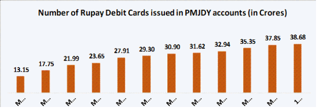पीएमजेडीवाई खाताधारकों को 38.68 करोड़ रुपे कार्ड जारी किए गए हैं: समय के साथ रुपे कार्डों की संख्या और उनके उपयोग में वृद्धि हुई है।