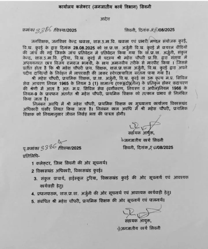 सतपुड़ा एक्सप्रेस सिवनी: ।जिले के कुरई विकासखंड अंतर्गत शासकीय प्राथमिक शाला अर्जुनी का एक वीडियो तेजी से वायरल हो रहा है। इसमें स्कूल के प्राथमिक शिक्षक महेश चौधरी द्वारा मासूम बच्चों से मारपीट और प्रताड़ना करते हुए देखा जा सकता है।जानकारी के अनुसार, शिक्षक महेश चौधरी पर लगातार बच्चों को पीटने की शिकायतें मिल रही थीं। हाल ही में कक्षा दूसरी के 6 वर्षीय छात्र रवि भलावी का गला दबाने और एक बच्ची को मारने का वीडियो सामने आया है।मामले की गंभीरता को देखते हुए जिला पंचायत उपाध्यक्ष राकेश सनोडिया अचानक अर्जुनी स्कूल पहुंचे। निरीक्षण के दौरान उन्होंने स्वयं पाया कि शिक्षक द्वारा बच्चों के साथ मारपीट की जा रही है।