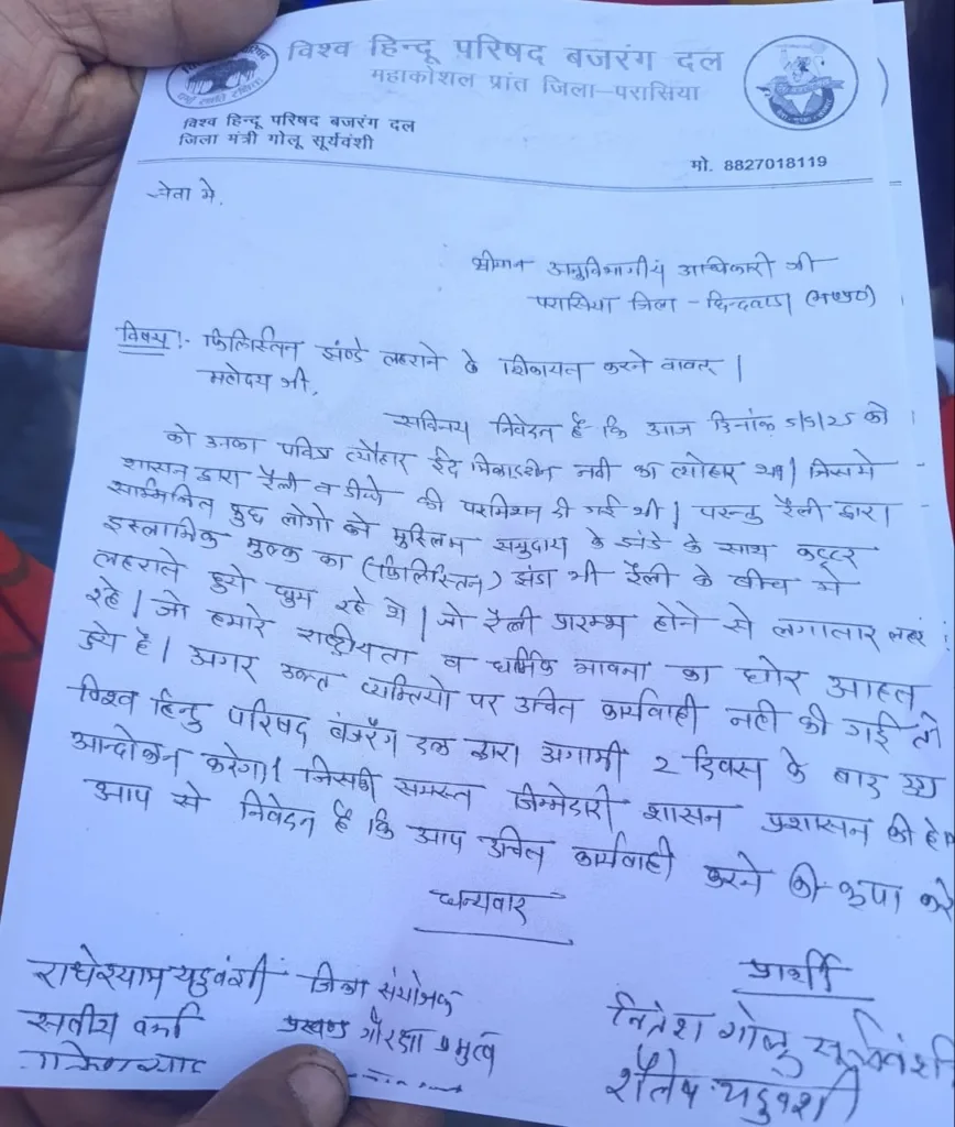 हिन्दू संगठनों ने जताया विरोध फिलिस्तीन का झंडा लहराने की घटना के विरोध में हिन्दू जागरण मंच, बजरंग दल समेत अन्य संगठनों ने गंभीर आपत्ति जताई है। संगठनों ने मामले में कार्रवाई की मांग करते हुए अनुविभागीय पुलिस अधिकारी (एसडीओपी) परासिया को ज्ञापन सौंपा है।