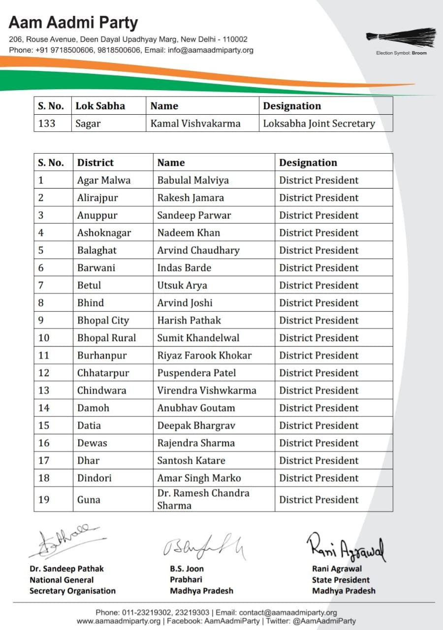 आम आदमी पार्टी की नई कार्यकारिणी घोषित