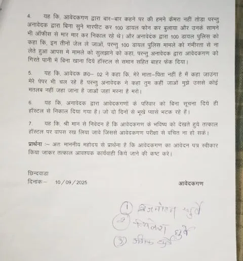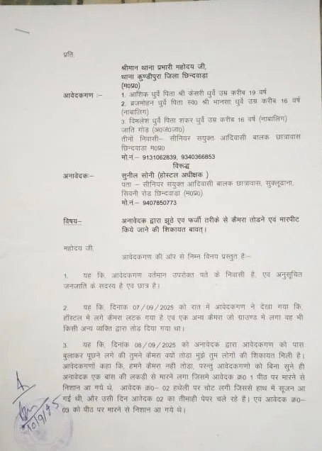गौरतलब है कि सुनील कुमार सोनी पर तीन आदिवासी छात्रों ने गंभीर आरोप लगाए हैं। छात्रों का कहना है कि उन्हें झूठे आरोप लगाकर बुरी तरह पीटा गया और हॉस्टल से निकाल दिया गया।छात्रों का आरोप आवेदकों में आशिक धुर्वे (19), ब्रजमोहन धुर्वे (16, नाबालिग) और विमलेश धुर्वे (16, नाबालिग) शामिल हैं। सभी अनुसूचित जनजाति (गोंड) के छात्र हैं और छिंदवाड़ा स्थित आदिवासी छात्रावास में रह रहे थे।छात्रों के अनुसार –07 सितंबर 2025 को हॉस्टल में लगे दो सीसीटीवी कैमरे टूटे पाए गए।08 सितंबर 2025 को अधीक्षक सुनील सोनी ने तीनों छात्रों को बुलाकर कैमरा तोड़ने का आरोप लगाया। छात्रों के इंकार करने के बावजूद अधीक्षक ने उन्हें बांस की लकड़ी से पीटा।पिटाई में छात्रों को हाथ, पीठ और शरीर पर चोटें आईं।अधीक्षक ने 100 डायल पुलिस को भी बुलाया और छात्रों को जेल भेजने की बात कही, लेकिन पुलिस ने आपसी सुलह का सुझाव दिया।इसके बाद अधीक्षक ने छात्रों को बारिश में बिना खाना दिए हॉस्टल से बाहर निकाल दिया था।