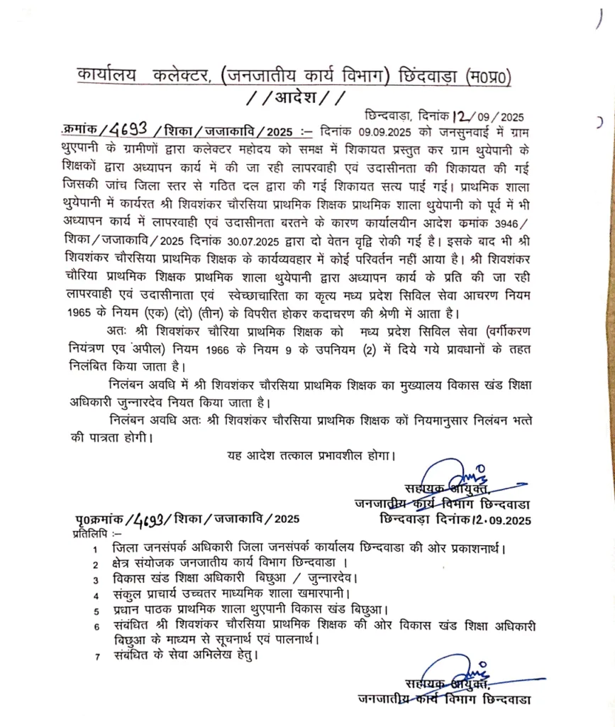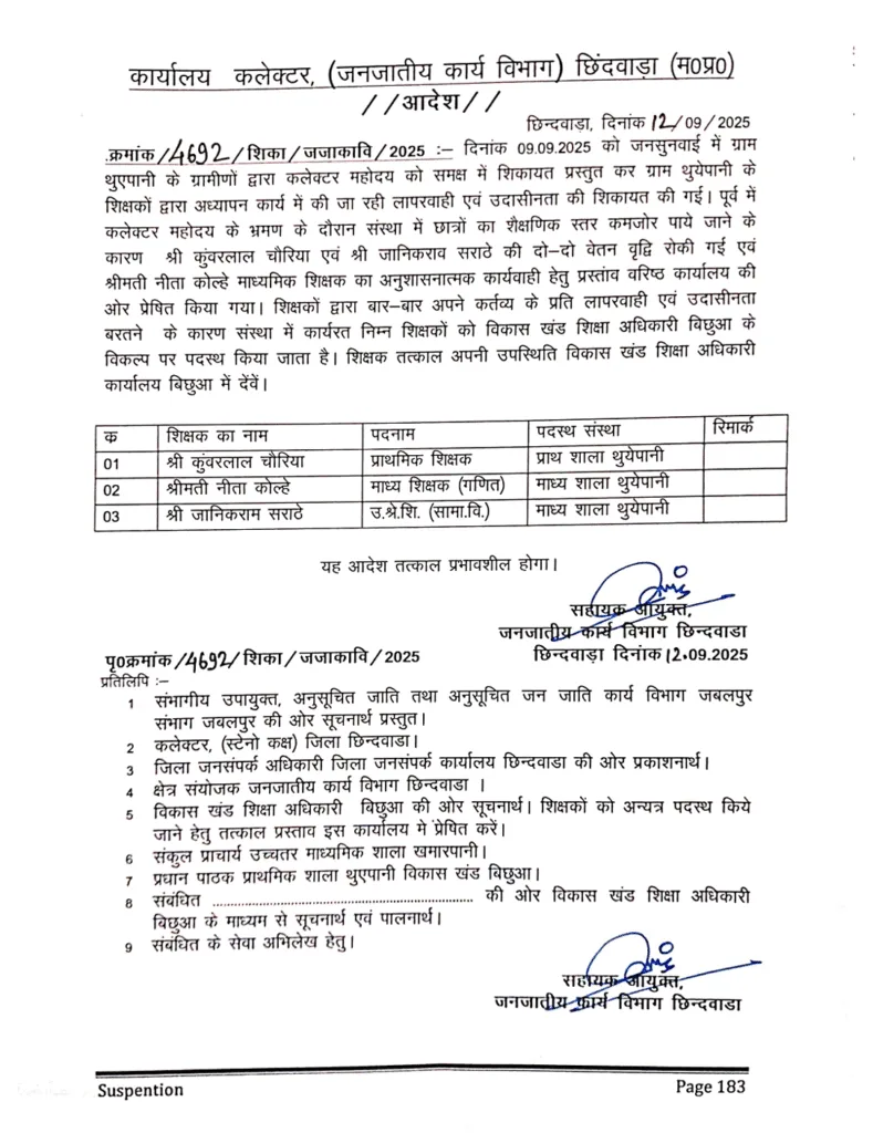 वहीं आज जारी एक अन्य आदेश में सुनील कुमार सोनी अधीक्षक संयुक्त बालक छात्रावास छिन्दवाडा द्वारा छात्रावास संचालन में की गई लापरवाही एवं उदासीनता, छात्रों द्वारा उनसे मारपीट करने की शिकायत की जांच क्षेत्र संयोजक जनजातीय कार्य विभाग से करायी गई। शिकायत सत्य पाये जाने के कारण सुनील कुमार सोनी अधीक्षक को संयुक्त बालक छात्रावास छिन्दवाडा के प्रभार से मुक्त करते हुए सहायक आयुक्त कार्यालय छिन्दवाड़ा में आगामी आदेश पर्यन्त कार्य करने हेतु आदेशित किया जाता है।