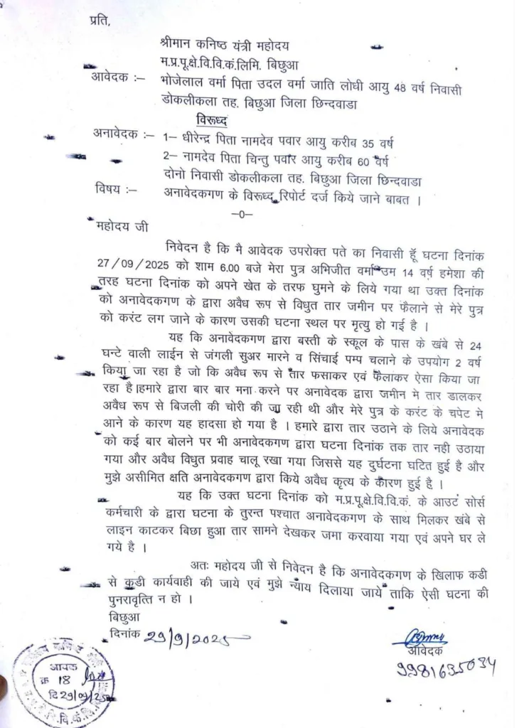 सतपुड़ा एक्सप्रेस छिंदवाड़ा। जिले के बिछुआ तहसील के ग्राम डोकलीकला में 27 सितंबर 2025 की शाम एक दर्दनाक हादसा हुआ। 14 वर्षीय अभिजीत वर्मा की करंट लगने से मौत हो गई। वह हमेशा की तरह शाम को खेत की ओर घूमने गया था, तभी जमीन पर बिछाए गए अवैध बिजली तार के चपेट में आ गया।