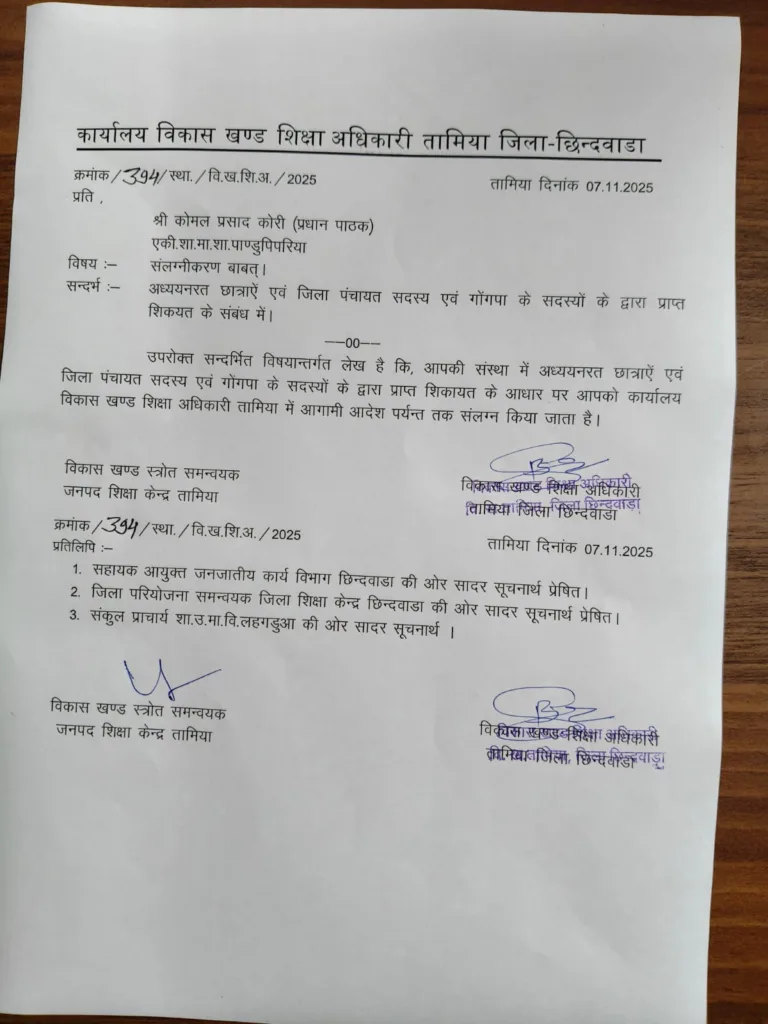 छात्राओं ने अन्य शिकायतें भी दर्ज कराईं बालिकाओं ने प्राचार्य के खिलाफ अन्य अनुशासनहीन व्यवहार से जुड़ी शिकायतें भी अधिकारियों को बताईं। मामला गंभीर होने पर तामिया बीईओ ने तत्काल कार्रवाई करते हुए प्राचार्य कोमल प्रसाद कोरी को बीईओ कार्यालय में अटैच कर दिया है।शिक्षा विभाग ने जांच शुरू की सूत्रों के अनुसार, शिक्षा विभाग ने इस पूरे मामले की प्राथमिक जांच प्रारंभ कर दी है। बालिकाओं के बयान दर्ज किए जा रहे हैं, और संबंधित अधिकारियों से स्पष्टीकरण मांगा गया है।