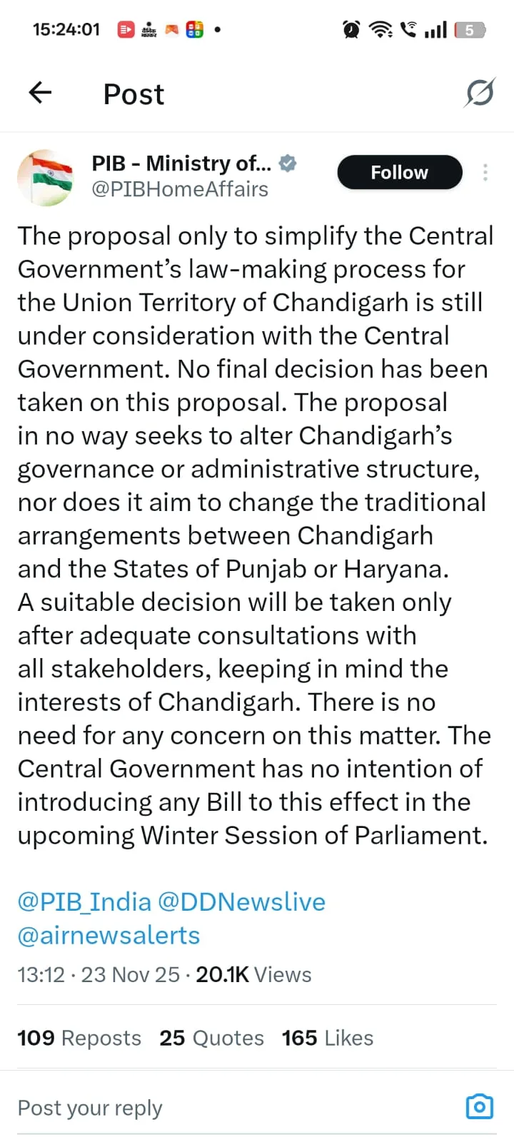 सतपुड़ा एक्सप्रेस नई दिल्ली। केंद्र शासित प्रदेश चंडीगढ़ के लिए केंद्र सरकार द्वारा कानून बनाने की प्रक्रिया को सरल करने से जुड़ा प्रस्ताव अभी भी केंद्र सरकार के पास विचाराधीन है। आधिकारिक सूत्रों के अनुसार, इस विषय पर सरकार ने अंतिम फैसला नहीं लिया है।सरकार ने x पर स्पष्ट किया है कि यह प्रस्ताव चंडीगढ़ के मौजूदा प्रशासनिक ढांचे या शासन व्यवस्था में किसी भी प्रकार का बदलाव लाने का प्रयास नहीं करता। न ही इसका उद्देश्य चंडीगढ़, पंजाब और हरियाणा के बीच लंबे समय से चली आ रही पारंपरिक व्यवस्थाओं में किसी तरह का परिवर्तन करना है।केंद्र का कहना है कि चंडीगढ़ के हितों को सर्वोपरि रखते हुए, सभी स्टेकहोल्डर्स से व्यापक चर्चा और सलाह-मशविरा के बाद ही किसी भी निर्णय पर अंतिम मुहर लगाई जाएगी। इसलिए इस विषय पर आम जनता को चिंतित होने की कोई आवश्यकता नहीं है।इसके साथ ही, सरकार ने यह भी स्पष्ट किया है कि संसद के आगामी विंटर सेशन में इस मुद्दे पर कोई बिल लाने का इरादा नहीं है।
