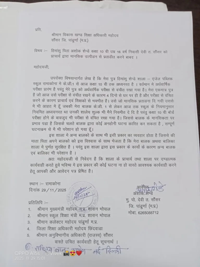 सतपुड़ा एक्सप्रेस सौसर। एंजल पब्लिक स्कूल में एक छात्र को परीक्षा देने से रोकनें का मामला गंभीर रूप लेता जा रहा है। कक्षा 10 वी में अध्ययनरत हिमांशु शेन्डे को विद्यालय प्रबंधन ने अर्धवार्षिक परीक्षा में बैठने से वंचित रखने पर पिता अषोक शेन्डे निवासी देवी ने विकासखंड शिक्षा अधिकारी के नाम शिकायत दर्ज करते हुये कार्यवाही की मांग की है। श्री शेन्डे का कहना है कि, प्राचार्य द्वारा हिमांशु शेन्डे को परीक्षा देने से वंचित रखने के कारण वह चार दिन से घर में है और मानसिक तनाव में है।