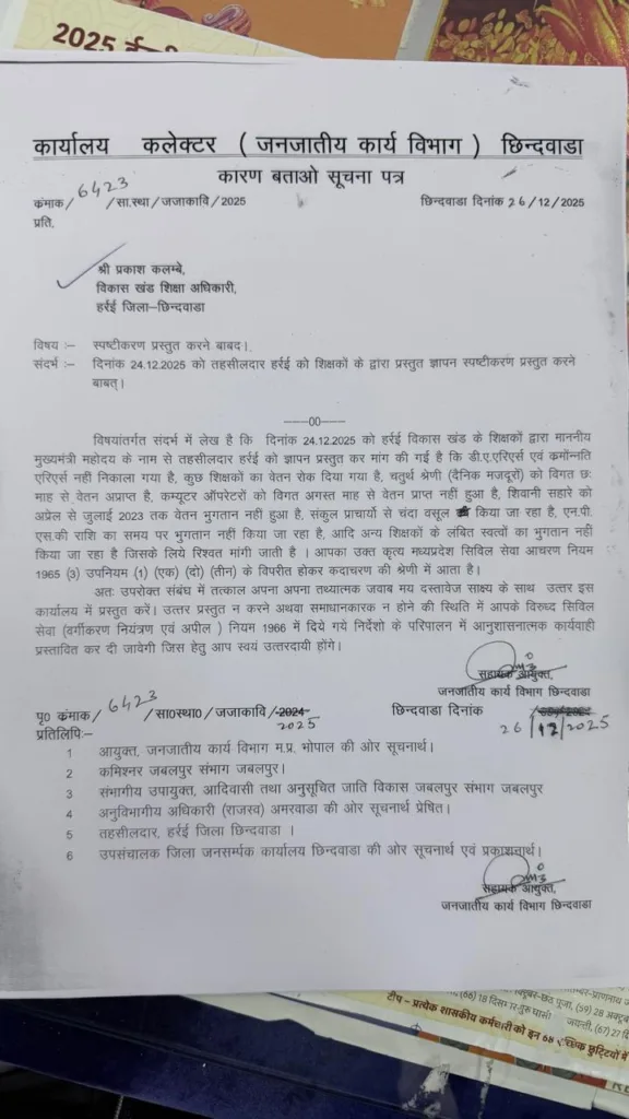 सतपुड़ा एक्सप्रेस छिंदवाड़ा | हर्रई विकासखंड में पदस्थ विकास खंड शिक्षा अधिकारी (BEO) प्रकाश कलम्बे की मुश्किलें बढ़ती नजर आ रही हैं। शिक्षकों द्वारा मुख्यमंत्री के नाम तहसीलदार हर्रई को सौंपे गए ज्ञापन के बाद अब जनजातीय कार्य विभाग, छिंदवाड़ा ने उन्हें स्पष्टीकरण नोटिस जारी किया है।