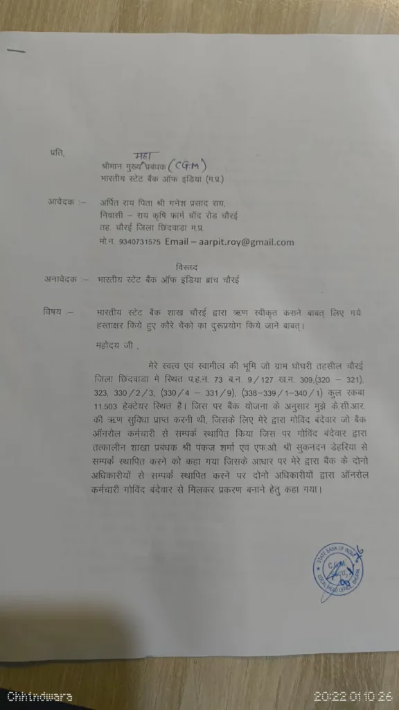 के सी आर ऋण के नाम पर लिए गए कोरे चेक शिकायत के अनुसार, अर्पित राय की ग्राम घोघरी, तहसील चौरई स्थित लगभग 11.503 हेक्टेयर कृषि भूमि के आधार पर के सी आर (KCR) ऋण स्वीकृत किया जाना था। इसके लिए उन्होंने SBI चौरई शाखा के ऑन-रोल कर्मचारी गोविंद बंदेवार से संपर्क किया, जिसने तत्कालीन शाखा प्रबंधक पंकज शर्मा और फील्ड ऑफिसर सुकनंदन डेहरिया से संपर्क कराने की बात कही। इन तीनों ने मिलकर मेरे साथ धोखा किया है।