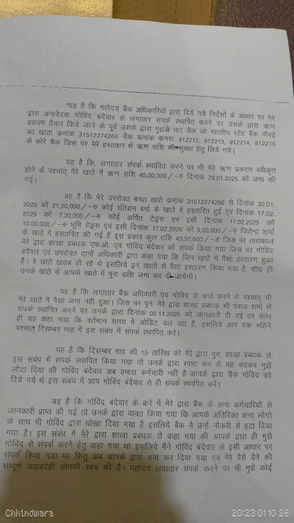 सतपुड़ा एक्सप्रेस छिंदवाड़ा। भारतीय स्टेट बैंक (SBI) की चौरई शाखा पर एक किसान के साथ बड़े स्तर की वित्तीय अनियमितता और धोखाधड़ी के गंभीर आरोप सामने आए हैं। पीड़ित किसान अर्पित राय, निवासी राय कृषि फार्म, चाँद रोड चौरई, ने इस मामले की शिकायत रिज़र्व बैंक ऑफ इंडिया के बैंकिंग लोकपाल, भोपाल से की है।
