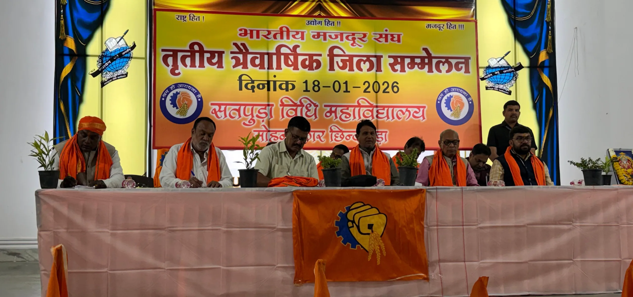सतपुड़ा एक्सप्रेस छिंदवाड़ा।स्थानीय सतपुड़ा विधि महाविद्यालय मोहन नगर में जिला समिति भारतीय मजदूर संघ तृतीय जिला सम्मेलन सम्पन्न हुआ। भारतीय मजदूर की रीति नीति के अनुसार आमंत्रित एवं मंचस्थ भारतीय मजदूर संघ के पदाधिकारियों के द्वारा भारत माता ,भगवान विश्वकर्मा एवं राष्ट्रीय ऋषि स्व.दत्तोपंत ठेगड़ी जी के छायाप्रतियों पर माल्यार्पण एवं दीप प्रज्जवलन का जिला सम्मेलन का आयोजन किया गया । मंचस्थ सभी वरिष्ठ पदाधिकारियों का अंग वस्त्र एवं पौधे देकर स्वागत किया गया ।