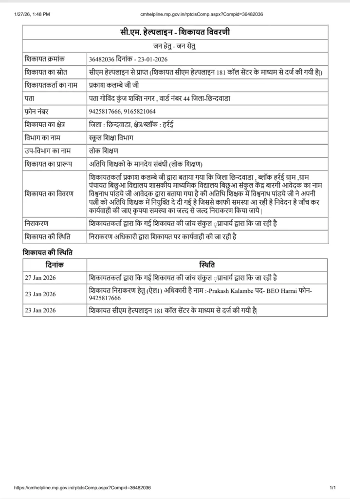 हालांकि शिक्षकों का कहना है कि पद से हटाए जाने के बावजूद पूर्व बीईओ प्रकाश कालम्बे हर्रई क्षेत्र के संदीपनी विद्यालय, कुछ संकुलों और छात्रावासों में अभी भी प्रभार में हैं, जिससे शिक्षक वर्ग में भय का माहौल बना हुआ है।शिक्षकों का आरोप है कि परीक्षा का समय नजदीक होने के बावजूद पूर्व बीईओ द्वारा सीएम हेल्पलाइन, झूठी खबरों और फर्जी शिकायतों के जरिए चिन्हित शिक्षकों को परेशान किया जा रहा है, जिससे शिक्षक मानसिक तनाव में हैं और इसका सीधा असर विद्यार्थियों की पढ़ाई पर पड़ सकता है।इन्हीं आरोपों के विरोध में आज शाम 5 बजे धनौरा थाने में संबंधित शिक्षकों एवं अधिकारियों द्वारा थाने में आवेदन देकर एफआईआर दर्ज कराने की मांग की। साथ ही पूरे मामले की निष्पक्ष जांच कर उचित कार्रवाई की मांग की गई है।