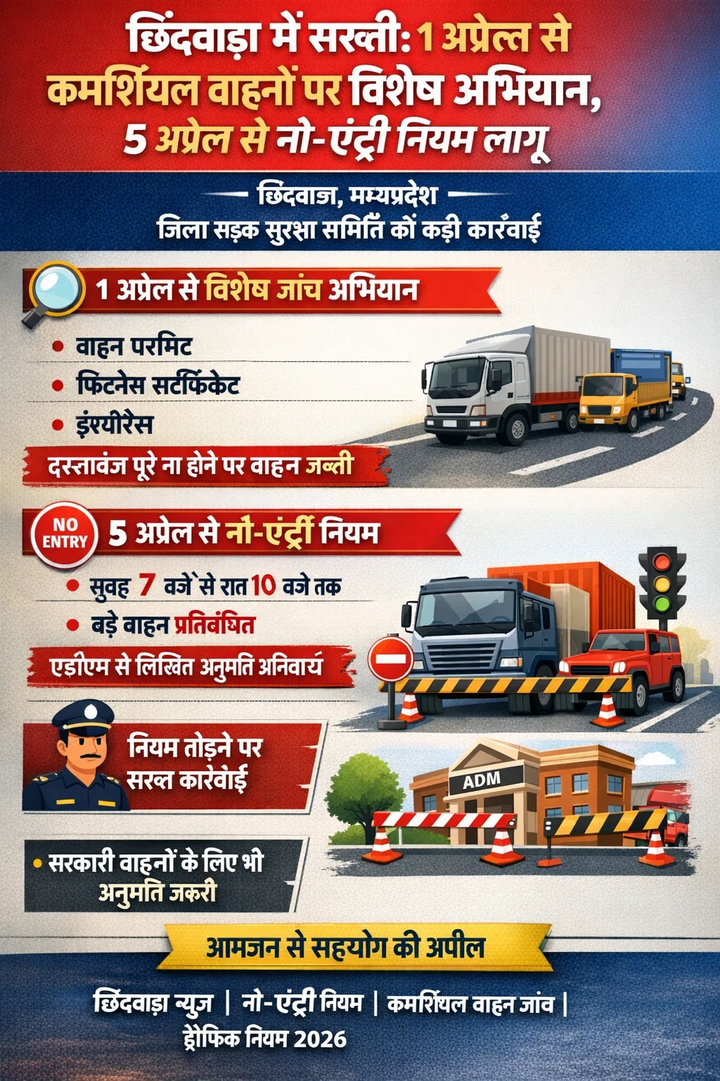 सतपुड़ा एक्सप्रेस छिंदवाड़ा, । जिला सड़क सुरक्षा समिति की बैठक में आमजन की सुरक्षा और यातायात व्यवस्था सुधारने के लिए कई अहम निर्णय लिए गए हैं। इन फैसलों के तहत अप्रैल महीने से जिले में सख्त कार्रवाई शुरू होगी, जिसका सीधा असर कमर्शियल वाहनों और भारी ट्रैफिक पर पड़ेगा।
