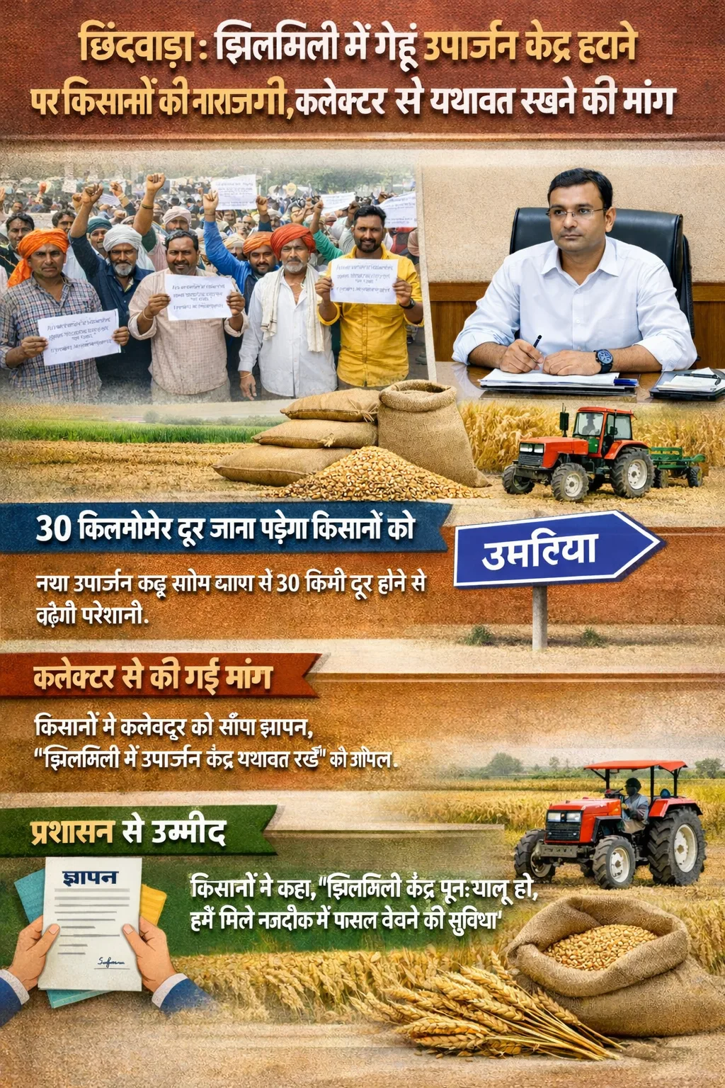 कलेक्टर से की गई मांग इस संबंध में किसानों ने जिला कलेक्टर छिंदवाड़ा को ज्ञापन सौंपकर मांग की है कि झिलमिली गेहूं उपार्जन केंद्र के वेयर हाउस को यथावत रखा जाए। किसानों ने बताया कि केंद्र हटने से परिवहन लागत बढ़ेगी और समय की भी बर्बादी होगी।