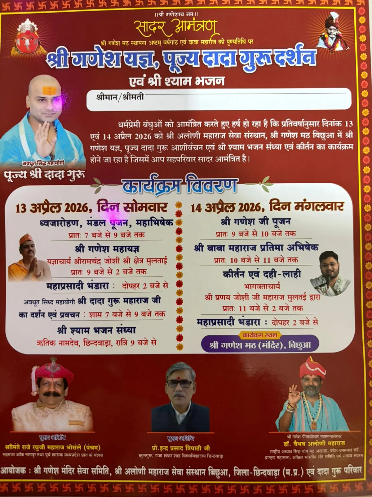 सतपुड़ा एक्सप्रेस बिछुआ। नगर के माता मां चौक स्थित गणेश मठ में श्री अलोणी महाराज सेवा संस्थान के द्वारा 13 अप्रैल को भव्य संत समागम का आयोजन किया जाएगा। गणेश मठ बिछुआ के पीठाधीश्वर महामंडलेश्वर डाॅ वैभव अलोणी ने बताया की 13 अप्रैल को शाम 7 बजे से संत समागम आयोजित होंगा। जिसमें नर्मदा उपासक निराहारी संत अवधूत सिद्ध महायोगी दादा गुरु महाराज का आगमन होंगा। संत समागम में संत दादा गुरु धर्म प्रेमियों को आध्यात्मिक मार्गदर्शन देंगे। साथ ही कार्यक्रम में अन्य साधु संत भी शामिल होंगे। बता दें कि प्रकृति के उपासक संत श्री दादा गुरु पिछले 5 वर्षों से केवल मां नर्मदा के पवित्र जल का सेवन कर रहें हैं। साथ ही वें मां नर्मदा के संरक्षण के लिए अब तक 4 बार परिक्रमा कर चुके हैं। मंदिर समिति के द्वारा धर्म प्रेमियों से कार्यक्रम में उपस्थिति की अपील की गई है। तो वहीं रात्रि में 9 बजे से श्री श्याम भजन संध्या में गायक ऋतिक नामदेव के द्वारा प्रस्तुति दी जाएगी।
