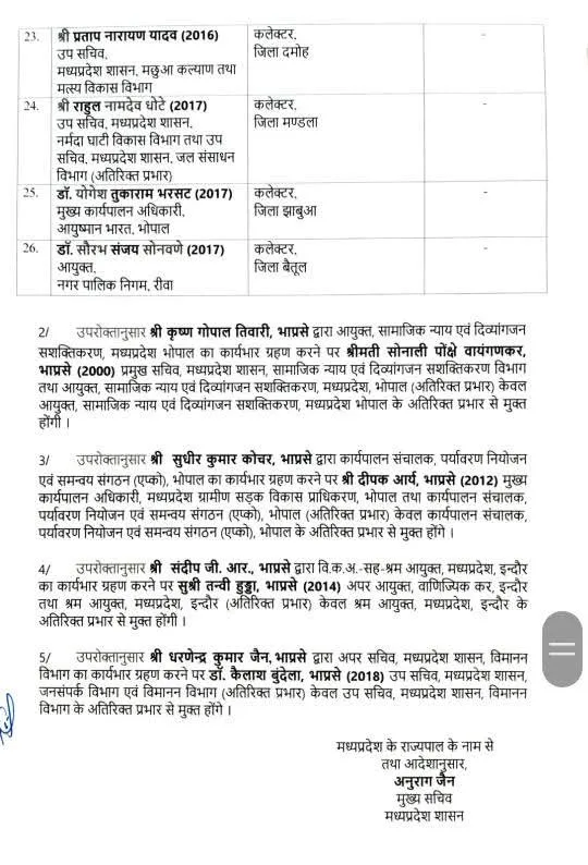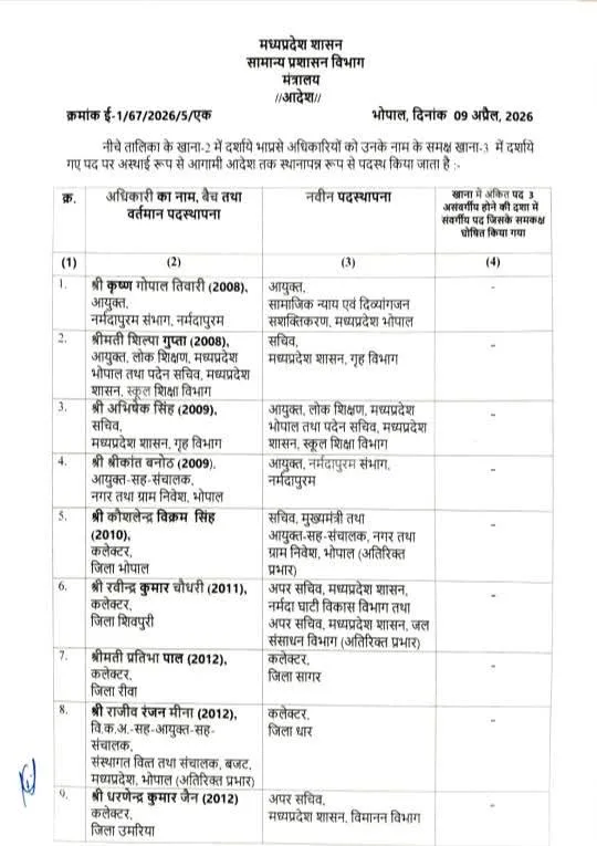सतपुड़ा एक्सप्रेस भोपाल।प्रदेश में एक बार फिर बड़े स्तर पर प्रशासनिक बदलाव किए गए हैं। सामान्य प्रशासन विभाग द्वारा जारी आदेश के अनुसार 26 आईएएस अधिकारियों के तबादले किए गए हैं, जिनमें 14 जिलों के कलेक्टर बदले गए हैं।