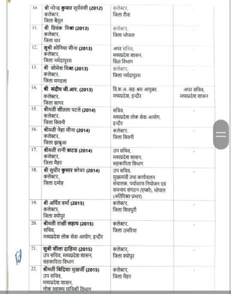 जिन जिलों के कलेक्टर बदले गए:सागरधाररीवाभोपालनर्मदापुरमसिवनीशिवपुरीउमरियाश्योपुरमैहरदमोहमंडलाझाबुआबैतूलयह प्रशासनिक फेरबदल शासन स्तर पर कार्यक्षमता बढ़ाने और प्रशासनिक व्यवस्थाओं को मजबूत करने के उद्देश्य से किया गया है।