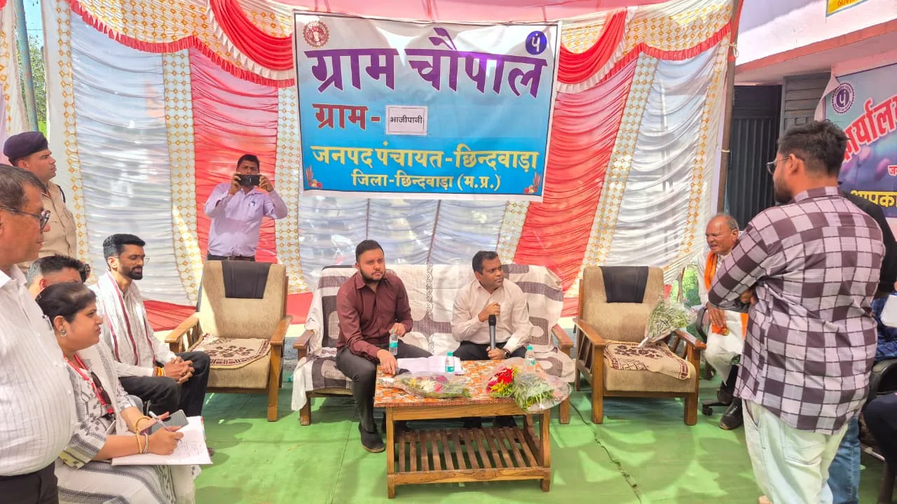 सतपुड़ा एक्सप्रेस छिन्दवाड़ा/15 अप्रैल 2026/ जिले में सुशासन को मजबूत करने और आमजन की समस्याओं के त्वरित निराकरण के उद्देश्य से कलेक्टर हरेंद्र नारायन लगातार ग्रामीण क्षेत्रों में चौपाल लगाकर सीधे ग्रामीणों से संवाद कर रहे हैं। इसी क्रम में बुधवार को जनपद पंचायत छिंदवाड़ा की ग्राम पंचायत भाजीपानी में चौपाल का आयोजन किया गया, जहां ग्रामीणों से सीधा संवाद कर उनकी समस्याएं सुनी गईं और उनके शीघ्र समाधान के निर्देश दिए गए। इस दौरान उनके साथ सीईओ जिला पंचायत श्री अग्रिम कुमार सहित सभी विभागों के जिला अधिकारी भी उपस्थित थे।
